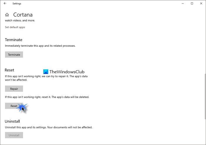 Cortana 의 충돌로 인해 문제가 발생할 수 있습니다 . 따라서 설정을 통해 Cortana 앱을 재설정하면(resetting the Cortana app via Settings) 문제가 자동으로 해결됩니다.